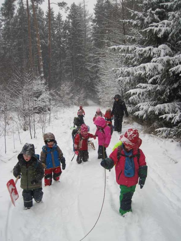 Endlich richtiger Winter! Unser Wald ist so schön in seinem weißen Schneekleid und die Kinder freuen sich natürlich auch über den vielen Schnee. Bevor wir uns im Tiefschnee auf den Weg nach hinten machen gibt es heute noch etwas ganz Besonderes im Morgenkreis. Warm eingepackt in Kühltasche und Wärmflasche hat Uschi uns den CD-Player mitgebracht und wir hören uns verschiedene Musikstücke an bewegen uns danach. So stellen wir fest, dass man nicht nur mit Farben und Worten Gefühle ausdrücken kann, sondern auch mit Musik. Wir hören ganz wilde, ganz traurige und sehr fröhliche Musik. Später dürfen die Kinder in Kleingruppen im Bauwagen auch noch zu dieser Musik malen. Doch zuerst steht einmal toben im Schnee auf dem Programm. Mit den Schneeschaufeln versuchen die Kinder beim Rutschberg eine Sprungschanze zu bauen und auch die Schlittenpferde werden wieder eingespannt. Zur Brotzeit wünschen sich die Kinder eine Geschichte und wir lesen vom kleinen Stationsvorsteher und der Kuh. Anschließend sind noch 2 Gruppen mit malen dran, während die anderen Kinder draußen den Schnee genießen. Da wird gerutscht, geschaufelt und natürlich Bibs und Schlitten gezogen. Fast vergessen wir die Zeit, so dass wir uns auf dem Rückweg richtig beeilen müssen, um pünktlich nach vorne zu kommen.