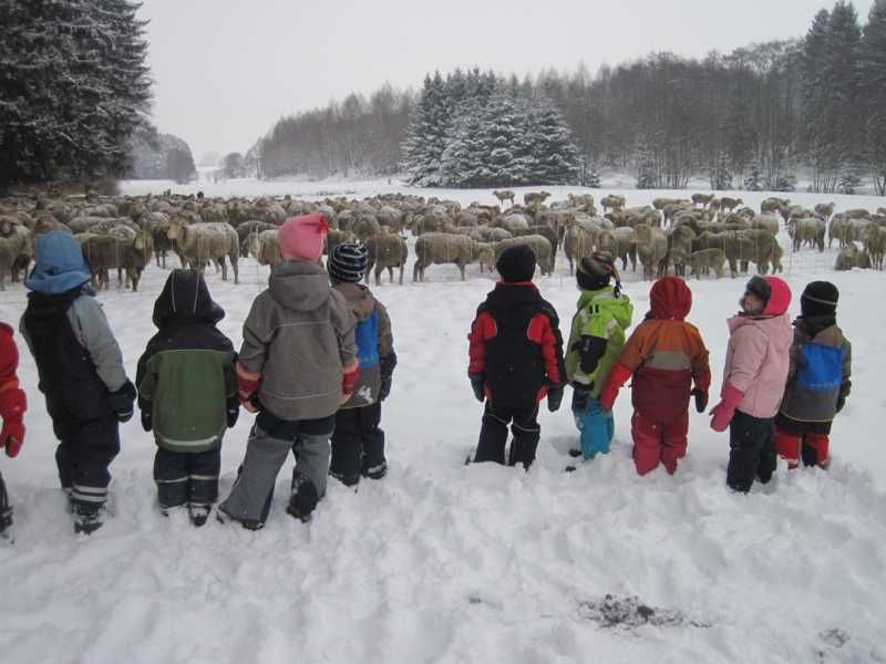 Viele Kinder haben es schon beim Kommen entdeckt, auf der Waldwiese sind, wie jedes Jahr um diese Zeit, wieder die Schafe da. Natürlich wollen wir sie nach dem Morgenkreis gleich besuchen. Wir gehen zur Waldwiese und fragen den Schäfer, ob wir ganz nah zu den Schafe dürfen und dann machen wir uns ganz langsam und leise auf den Weg. Immer wenn die Schafe unruhig werden bleiben wir wieder stehen, bis sie sich beruhigt haben und so pirschen wir uns immer näher heran. Eine tolle Übung zur Achtsamkeit und die Kinder sind wirklich sehr achtsam. Danach machen wir uns auf den Weg zum Bauwagen. Während die Großen zur Vorschule im Bauwagen verschwinden dürfen die jüngeren Kinder draußen spielen. Zur Brotzeit treffen wir uns im Bauwagen und hören die Geschichte “König Winters Erwachen”. Eine wunderschöne Geschichte, die den Kindern so gut gefällt, dass Luis, Lea, Lisa, Sina, Emily und Franziska si draußen gleich nachspielen wollen. Ansonsten ist natürlich wieder rutschen auf unserem Hügel und Schneeschippen angesagt.