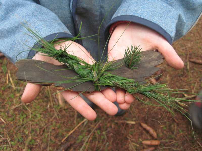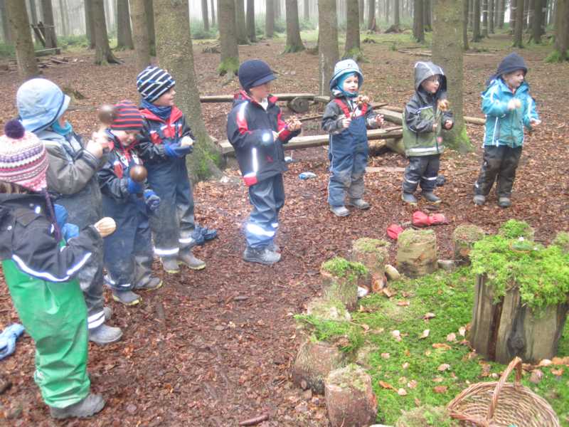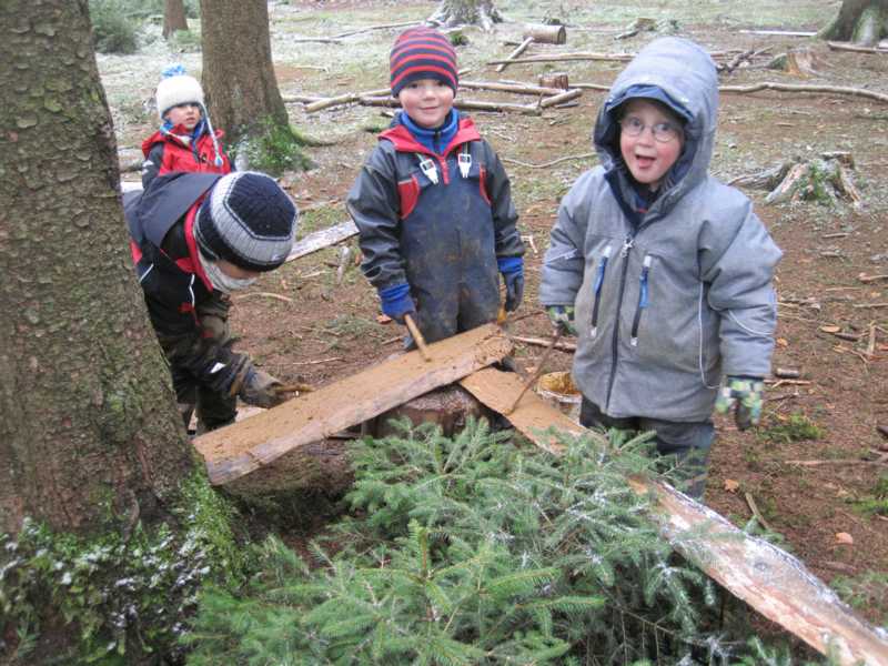 “He hename”, so wecken wir den Bären aus dem Winterschlaf und noch schöner wird es, als jedes Kind noch eine Rassel dazu bekommt. Die Kinder sind mit viel Spass bei der Sache. Anschließend im Freispiel verschwinden Luis, Leo, Isidor, Bjarne, Severin, Max und Johannes in Richtung Zelt, wo sie sich mit riesigen Stangen ein Boot bauen, nur anschließend werden sie sich nicht ganz einig, ob sie Piraten oder Drachenjäger sind, sie haben sich wohl für abwechseln entschlossen, da sie jedesmal wenn man sie sieht gerade etwas anderes sind. Paul, Anna, Timo, Lisa und Franziska bauen einen “Schlumpf-Plantschi” und laufen gefühlte 100x zum Bach um Wasser zu holen, weil das Poolwasser immer wieder versickert. Lea beginnt ein riesiges Mandala aus Fichtenzapfen und auch Emily ist sehr kreativ, aus Rinde, einem kleinen Fichtentrieb und dem ersten langen Gras macht sie ein “Naturkunstwerk”