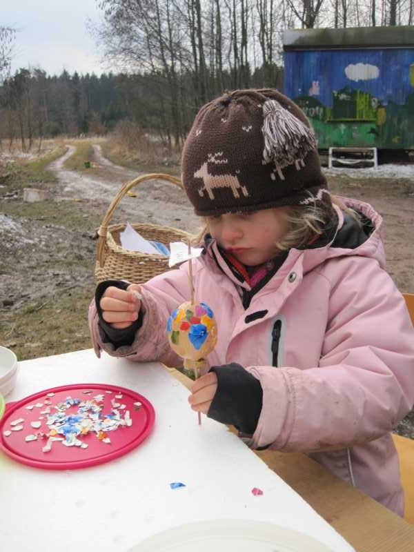 Gemeinsam mit den Mamas die zum heutigen Elterncafe bleiben wecken wir mit singen, tanzen und rasseln den Bären aus dem Winterschlaf und es tönt “He hename” durch den Wald. Dann verschwinden die Kinder ins Spieleland, holen sich zwischendurch immer mal wieder eine Leckerei ab und die Mamas haben Zeit sich zu unterhalten. Ob es wohl an der Kälte liegt, dass die Mamas schon relativ früh wieder gehen? Wir machen uns dann allerdings gleich auf den Weg nach hinten in die Sonne und machen Brotzeit. Anschließend stellen wir den Tisch raus und die ersten Kinder dürfen anfangen ihre ausgeblasenen Eier in Mosaiktechnik zu gestalten.