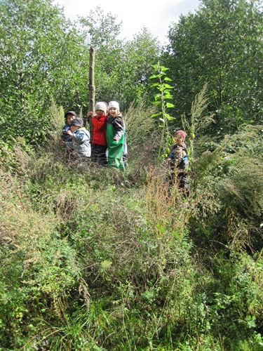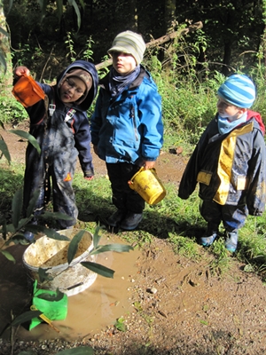 Mit einem freundlichen „Sonne liebe Sonne“ versuchen wir die Sonne hinter den Wolken hervor zu locken, was uns auch tatsächlich gelingt und so gehen wir nach dem Morgenkreis gleich zum Bauwagenplatz. Lisa und Lilith machen sich gleich auf Stein- später auf Regenwurmsuchen und freuen sich sehr, dass sie sogar einen Marienkäfer finden. Mara, Anna, Franziska und Paul entdecken die Lehmgrube für sich und binden sie gleich in ihr Wildpferdespiel mit ein, da dort leckeres Essen gemacht werden kann. Hinter dem Bauwagen bauen sich Johannes, Severin, Max, Klausi und Martin aus den Ziegelsteinen ein Piratenschiff mit Kombüse. Timo, Bjarne und Simon sind an unserer größten Pfütze beschäftigt. Nach der Brotzeit geht es dann erstmal etwas stürmischer zu, da viele kleine Wildpferde von Jägern (Johannes, Max und Severin) gefangen werden. Erst als unser Berg zum ersten Mal in diesem Jahr erklommen wird, wird es wieder etwas ruhiger. Im Abschlußkreis überlegen wir gemeinsam, was wir alles in unseren Rucksäcken haben und jeder darf etwas dazu sagen. Schließlich schauen wir uns einen Rucksack genauer an und lernen das Lied „Ich habe eine Maus gesehen, die wollt im Kindergarten gehen.“ Zum Abschluß gibt es dann noch einige „witzige“ Variationen und Eigenkompositionen von Mäuseliedern, die uns einige Kinder ganz mutig vorsingen, bovor wir wieder nach vorne gehen.