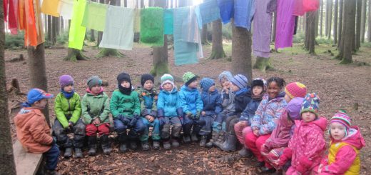 Heute ist es richtig dunkel bei uns im Wald und es regnet und regnet. So singen wir im Morgenkreis gleich “Regen, Regen tropf tropf tropf”, zuerst alle zusammen, dann nur die Mädchen, dann nur die Jungs. So und dann nichts wie ab zum spielen. Martin und Klausi finden zwei riesige Hammer und sind von einer Wurzel zur nächsten unterwegs, um zu hämmern. Elisabeth, Veronika, Lilija und Simon bauen sich ein Häuschen aus Brettern und spielen Familie. Dann gibt es auch noch eine große Einhornfamilie beim Kletterseil (Franziska, Mara, Sina, Lisa und Paul) Max und Johannes arbeiten an der gestrigen Bühne sind am umbauen und hämmern und dazwischen wird immer mal wieder getrommelt. Als Bjarne und Sino später dazukommen schließen sie sich ihnen an. Eigentlich ist es ja garnicht so schlimm mit dem Regen, es hört auch immer mal wieder auf, aber zur Brotzeit sind wir dann doch froh, als wir in das trockene Zelt können. Nach dem essen gehen wir gleich wieder raus und toben uns bei einem Lauf- und Reaktionsspiel so richtig aus. Alle kleinen Mäuse dürfen durch den Wald laufen und tanzen, bis sie sich auf Zuruf in Sicherheit bringen müssen (Eule = am Boden ganz klein machen, Fuchs = hinter einem Baum verstecken, Mader = zu den Mamas laufen. Anschließen haben wir dann auch wieder genug Sitzfleisch um im Zelt das Bilderbuch “Vom Apfelmäuschen” anzuschauen. Dann bleibt uns noch etwas Zeit zum spielen bis die Mamas kommen. Renate entdeckt auf dem Weg einnen riesigen Regenwurm, den wir ganz lange bei seiner “Wegüberquerung” beobachten. Wäre hätte gedacht, das eine Regenwurmbeobachtung so interessant ist, dass 9 Kinder eine halbe Stunge damit beschäftigt sind. Wow! Da sich viele Regenwurmfragen ergeben haben verspricht Renate morgen ein Regenwurmbuch mitzubringen.