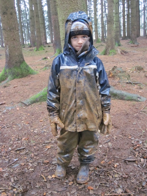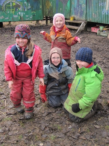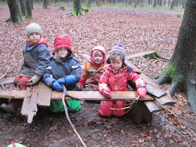 Heute regnet es aber wirklich den ganzen Vormittag ununterbrochen, und trotzdem spielen die Kinder eigentlich richtig schön. Johannes, Max, Bjarne, Severin, Sina und Lisa sind vorne am Weg beim Bach und füllen alles Wasser aus den Pfützen in den Bach. Klar, das es nur daran liegen kann, dass nun beim Bach Hochwassergefahr herrscht. Klausi, Martin und Simon versuchen die große Pfütze am Weg, bei dem kleinen Holunder zu entleeren. Die Mädchen bauen mit den Brettern eine große Geburtstagstafel auf, denn heute soll Geburtstag gefeiert werden, sie sind sich nur noch nicht ganz einig, ob das Baby, oder doch die Katze Geburtstag hat. Man wird sehen. Obwohl die Kinder trotz allem so schön spielen, fangen die ersten Kinder ein wenig früher als sonst an nach der Brotzeit zu fragen. Wir machen uns heute ein richtig großes warmes Feuer und freuen uns sehr im Warmen und vor allem im Trockenen zu sitzen. Nach der Brotzeit erfinden wir alle gemeinsam eine eigene Regengeschichte und endlich spielen wir auch Schlüsselkönig, was die Kinder sich schon lange mal wieder wünschen. Bevor wir schließlich wieder in die Nässe rausgehen, wärmen wir uns bei einem recht bewegtem “Kochtopfspiel” noch mal ordentlich auf. Beim Abholen dürfen die Mamas und Papas heute jede Menge kleine nasse Dreckspatzen abholen.