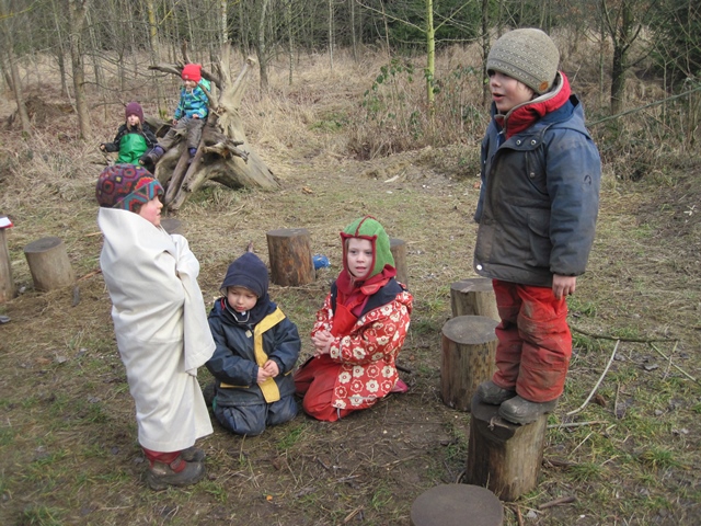 Wie viele Jungen und Mädchen wir heute wohl haben. Als wir nach dem Morgenkreis die Kinder zählen wollen wir das gleich mal sehen und so gehen alle Mädchen ins Häuschen und alle Jungs zum Maibaum und siehe da, als die Kinder zählen stellen sie fest, dass es genau gleich viele Jungs und Mädchen sind. Da hilft auch alles austricksen nichts, denn als Uschi, Tanja und ich die Mädchengruppe stärken wollen, so dass es mehr Mädchen sind, beanstanden die Jungs gleich, dass wir ja keine Mädchen mehr sind, sondern Frauen. Tja, da haben sie wohl recht. Dann dürfen die ersten Kinder mit Uschi im Bauwagen, denn wenn schon kein Schnee von oben kommt machen wir uns eben selbst einen. Vorne wird wieder fleißig gekocht, denn es gibt immer noch einige Pfützen aus denen man Wasser für leckere Suppen schöpfen kann. Timo, Mara und Anna bauen sich ein großes Tiergehege und bekommen auch immer wieder von den Einhörnern Paul und Franziska Besuch. Zur Brotzeit gehen wir nach hinten und haben sogar das Glück, dass die Sonne ein wenig rauskommt und uns beim Essen wärmt. Dann ahebn die Kinder nochmal ein wenig Zeit zum sausen und spielen, bevor wir zum Abschlußkreis klatschen, denn heute haben wir noch etwas Besonderes vor. Wir wollen nämlich das Märchen von Frau Holle nachspielen. Gemeinsam überlegen wir zuerst einmal, welche Rollen denn alles besetzt werden müssen. Dann darf jedes Kind sagen, was es selbst am allerliebsten spielen würde. Welch ein Glück es geht sich bis auf eine doppelte Wunschrolle und 2 unbesetzte Rollen perfekt auf. Aber was machen wir nun mit 2 Goldmaries und ohne Frau Holle und Pechmarie? Uschi und ich nehmen uns ersteinmal ganz raus aus der Diskussion und die Kinder haben es in weniger als 2 Minuten ganz selbstständig gelöst. Das Spiel kann also losgehen. Während wir erzählen spielen die Kinder und sprechen ihren Text frei. Wieder einmal sind wir sehr überrascht von unseren Kindern und vorallem sehr stolz auf sie. Es macht allen sehr viel Spass und es wird mit Sicherheit nicht unser letztes Rollenspiel gewesen sein.
