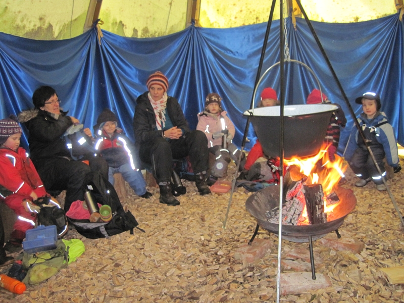 Wie (fast) jeden Morgen, so besprechen wir auch heute, wie der heutige Tag heißt, welchen Monat und welche Jahreszeit wir haben. Natürlich gebärden wir auch dazu und dann geht´s ab zum spielen. Da wir heute 2 Bobs im Wald haben sind die Kinder abwechselnd als Schlittenhunde und -pferde unterwegs und die jüngeren Kinder werden auf den Schneeresten durch den Wald gezogen. Anna und Timo fühlen sich heute als Eisbären so richtig wohl und Franziska bearbeitet mit einem Stück Eis eine Schneekugel von gestern und macht sich einen Stuhl daraus. Klausi, Max, Mara und Lilith sind hinten im Bauwagen um ihre Schneeflocken aufzufädeln. Als sie zurückkommen ist es schon höchste Zeit für unsere Brozteit. Anschließend ist heute wieder Märchenstunde angesagt. Also, schnell die Rucksäcke aufhängen, eine Runde sausen und dann zurück zum Zelt, wo die Kinder wieder einzeln durch unser Märchentor ins Märchenzelt dürfen. Heute entdecken die Kinder in unserer Märchen-Schatztruhe ein Stück von einem Ast. Zu welchem Baum, bzw. Strauch und vor allem zu welchem Märchen das wohl gehört? Ganz aufmerksam lauschen die Kinder der Kalimba und dann geht das Märchen auch schon los. Auch in unserem heutigen Märchen “Holunder tut Wunder” kommt wieder Frau Holle vor und wir erfahren, wie der Hollerbusch zu seinem Namen kam. Klar, dass wir uns da gleich noch einen leckeren Hollerpunsch schmecken lassen und dann, wie die Kinder in der Geschichte, Ringel Reihen tanzen.