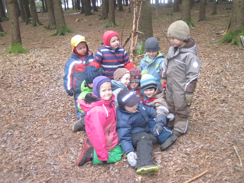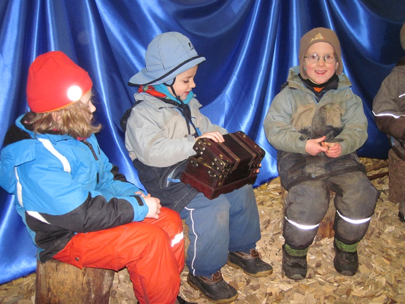 Oje, was ist diese Woche nur los, wir zählen nur 12 Kinder im Morgenkreis und erwarten so einen recht gemütlichen Tag. Zuerst einmal erzählen wir allerdings Ulrike unser Märchen von gestern und beschließen es nach zu spielen. Den Kindern macht es so viel Spass, dass wir es gleich 2x spielen müssen. Unsere Kinder sind wirklich die reinsten Schauspieler. Es hat ihnen wirklich so viel Spass gemacht, dass die meisten Kinder es gleich noch für das Freispiel aufgreifen und weiter spielen. Nur Klausi, Martin und Simon suchen sich lieber eine große Eiskugel die sie mit Stöcken bearbeiten. Etwas später kommt Lilith und hat heute ein Xylophon dabei, womit sie natürlich die Aufmerksamkeit der anderen sehr auf sich zieht. Zur Brotzeit gehen wir nach hinten und es soll sich als sehr praktisch erweisen, dass wir heute so wenig Kinder sind, denn im großen Bauwagen ist das Gas aus. So heizen wir ganz schnell den kleinen Bauwagen ein und machen es uns gemütlich. Nach der Brotzeit spielen wir “Bello dein Knochen ist weg”, bevor wir wieder raus gehen und noch ein wenig Zeit zum spielen haben, bevor wir uns auf den Weg nach vorne machen.