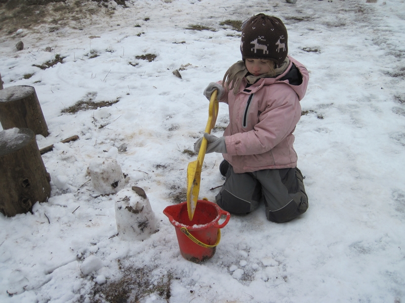 Nach dem wir am Freitag unser neues Lied „ Oh weh, oh weh , noch immer liegt kein Schnee“ gesungen haben, hat Frau Holle am Wochenende wenigstens einige Betten geschüttelt, sodass heute Morgen immerhin der Weg und die Waldwiese weiß sind. Die Kinder rollen 4 große Schneekugeln, die wir dann mit Hilfe eines Brettes gemeinsam aufeinandertürmen. Es fällt nasser Schnee und bevor es dann richtig anfängt zu regnen gehen wir nach hinten zum Bauwagen. Das Rutschen mit den neuen Poporutschern klappt allein, zu zweit, auf den Knien, auf dem Bauch oder auch sitzend richtig prima und macht viel Spaß. Auch das Anstellen und am Seil hochhangeln klappt super. Nach einiger Zeit lässt das Rutschfieber ein wenig nach und Johannes, Max, Franziska, Sina und Severin beginnen mit Uschi, Tanja und Ulrike ein Iglu zu bauen. Bald sind fast alle Kinder dabei und es wird Schnee von überall mit Eimer, Bob und Schneeschaufeln herbeitransportiert. Leider fängt es dann immer stärker an zu regnen und so machen wir erst mal gemütlich Brotzeit im Trocknen. Wir lesen eine Geschichte vom kleinen Stationsvorsteher und tatsächlich hört es mit Brotzeitende auch auf zu regnen. Zum Abschlußkreis gehen wir wieder nach vorne und treffen uns auf dem Spielfeld zu einem Bewegungsspiel. Die Kinder dürfen sich ganz dicht als Bettdecke zusammenstellen und werden von Uschi als Frau Holle kräftig ausgeschüttelt. Die Federn fallen tanzend als Schneeflöckchen auf die Erde und so darf sich jedes Kind überlegen, wo es dort als Flöckchen landen möchte. So manches Flöckchen fällt auf den Kamin, die Terrasse, auf eine Blume oder auch auf die Nase.