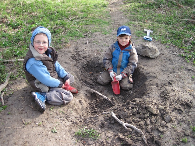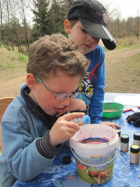 Heute wird es allerhöchste Eisenbahn, dass auch noch die letzten Kinder ihre Eier marmorieren und so gehen wir gleich nach dem Morgenkreis nach hinten. Severin und Bjarne beginnen ein großes Projekt, sie wollen ein großes Loch für ein Schwimmbad ausheben. Später schließen sich ihnen auch noch Paul, Johannes und Max an. Klausi, Timo und Martin arbeiten hinter dem Bauwagen an ihrer Wurzel weiter, auch wenn ausser ihnen niemand so ganz genau weiß, was das wird. Außerdem eröffnen die Mädels beim Unterstand einen Pferdestall und wir sind wieder gefordert jede Menge Pferd zu verkaufen. Zur Brotzeit lesen wir endlich in unserem Buch weiter. Wir wissen ja jetzt was dem kleinen Tiger seine allerliebste Leibspeise ist, ab was sind denn so die Leibspeisen unserer Kinder. Ich glaube Pfannkuchen wurde eindeutig am häufigsten genannt. Nach einer weiteren Spielrunde wird es Zeit für unseren Abschlußkreis und da singen wir unser Notruflied. Ob die Kinder wohl alle sagen könnenten, wo sie wohnen, sollte mal etwas passieren? Das probieren wir doch gleich mal aus und wir sind sehr erstaunt, wie gut es die meisten Kinder wissen.