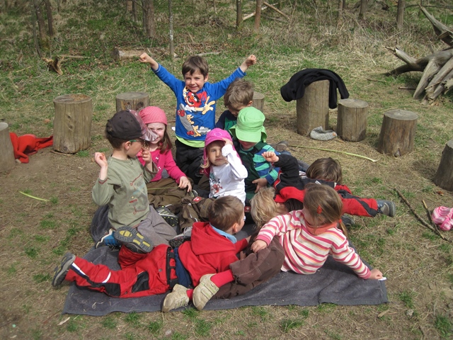 Nach unserem Begrüßungslied und einer Zählrunde gehen wir gleich nach hinten zum Bauwagen. Kaum ist der Maltisch an einem sonnigen Plätzchen aufgestellt, ist er auch schon vollbesetzt. Frühlingsbilder und Schatzkarten werden angefertigt. Lisa und Sina hängen ihr Frühlingskunstwerk mit Wäscheklammern zur Verzierung in einen Baum. Klausi lädt uns ein, mit Hilfe seiner Schatzkarte einen großen Schatz zu suchen. An einem zweiten Basteltisch dürfen zunächst Martin, Franziska, Anna und Severin ihre Gipsfingerpüppchen fertig machen bevor wir mit unserer Osterbastelarbeit beginnen. Unterm Bauwagen haben sich Laura und Elisabeth eine Suppenküche eingerichtet und im kleinen Bachsteinhaus sind Lilja, Mara und Anna ebenfalls mit Kochen beschäftigt. Nach der Brotzeit bricht das Schnitzfieber aus und so werden im Rundlingkreis unterschiedlich spitze Stöcke angefertigt. Später richtet Max die Werkstatt ein und schon bald gesellen sich Martin und Klausi , die zuvor ganz vertieft an ihrer kleinen Wurzel gespielt haben ,dazu. Gemeinsam wird roter Backsteinpuder mit Hammer und Feile hergestellt. Im Abschlußkreis lesen wir passend zur Vorosterzeit das Bilderbuch“ Das schönste Ei der Welt“.