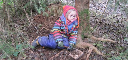 Die Jungs bauen an ihrem Haus weiter und um und sind damit den ganzen Tag beschäftigt. Da wird geplant und palavert, was das Zeug hält. Direkt daneben gibt es ein “Mädchenhaus” in dem lecker gekocht wird und sogar ein toller Ballerinatanz vorgeführt wird. Zwei Kinder haben sich tolle Bulldogs gebaut und rattern mit großem Gedöns durch den Wald, nur hin und wieder bleiben die Motoren stehen und die beiden verwandeln sich in Dinos, was übrigens auch nicht leiser ist 😉 Natürlich wird auch an der Sonnenwurzel fleißig gekocht.