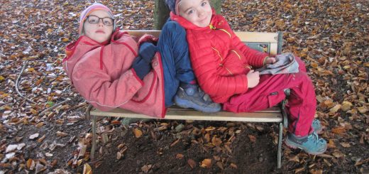 Dann holen wir unsere Rucksäcke und machen uns auf den Weg zum Bauwagen. Dort muss erst mal die ganze Aufregung in Bewegung umgestezt werden und was eignet sich da besser, als Lavamonster spielen 😉 Gut, ein paar Kinder buddeln lieber unterm Bauwagen und sieben Erde, aber der Großteil der Kinder ist am Unterstand.