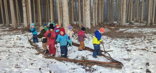 Nach der Brotzeit müssen wir schauen, dass alle Kinder schnell wieder in Bewegung kommen. Wir spannen das „Purzelseil“ und beim Turnen wird es schnell wieder warm.